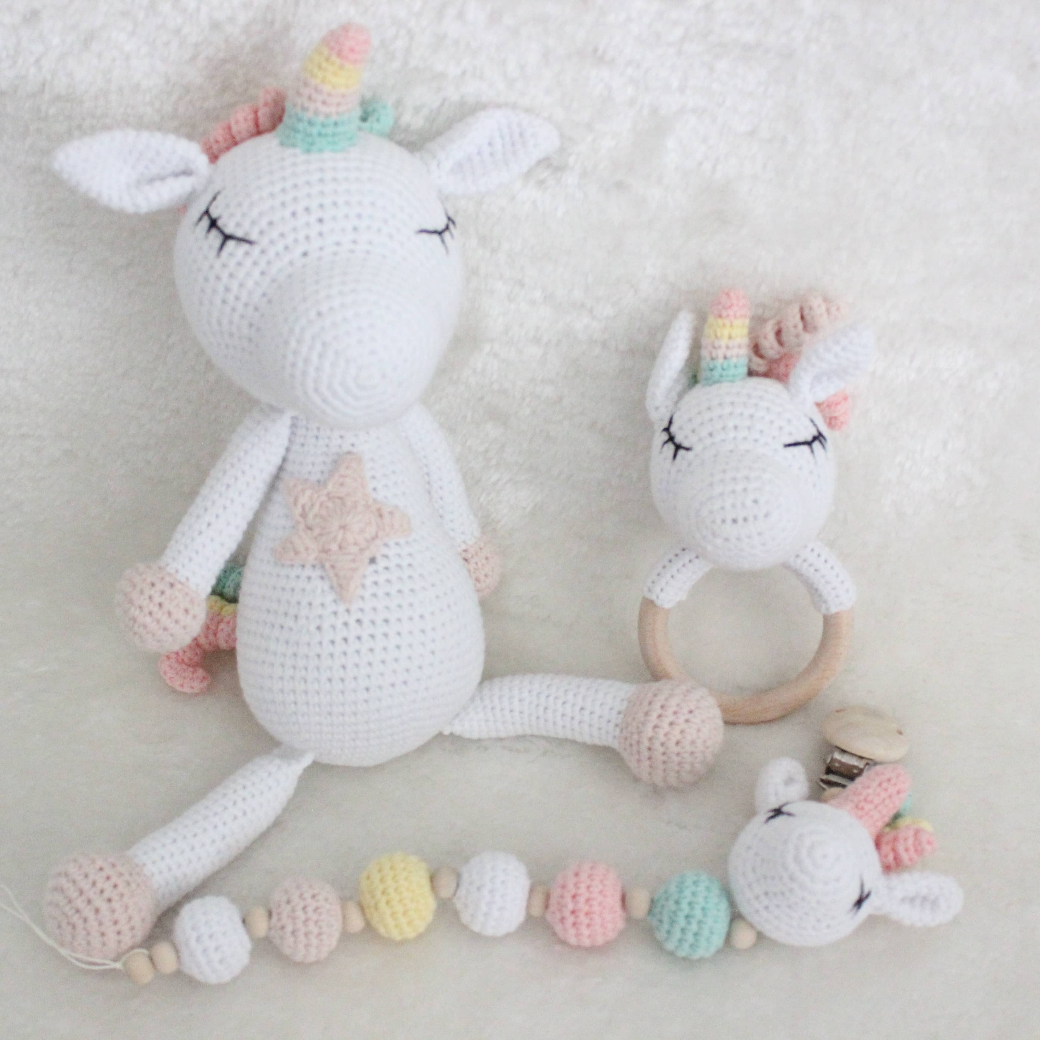 Amigurumi Set – Kuscheltier & personalisierbare Schnullerkette mit Rassel Dieses liebevoll handgefertigte Amigurumi-Set ist das perfekte Geschenk für kleine Entdecker und ein wunderschöner Begleiter im Alltag. Es besteht aus einem kuschelweichen Häkel-Tier, einer personalisierbaren Schnullerkette mit integrierter Rassel und einem Holzbeißring – alles in einem harmonisch aufeinander abgestimmten Design. Personalisiert mit deinem Wunschnamen Mach dein Set zu etwas ganz Besonderem: Die Schnullerkette kann individuell mit dem Namen deines Kindes gestaltet werden. Trage einfach den gewünschten Namen bei der Bestellung in das entsprechende Feld ein. Hochwertige & kinderfreundliche Materialien Alle Teile werden aus 100 % Baumwollgarn gehäkelt und enthalten keinerlei schädliche Stoffe – perfekt geeignet für Babys und Kleinkinder. Die verwendeten Holzperlen und der Beißring sind speichelfest und glatt verarbeitet. **Pflegehinweise:** - Kuscheltier: Waschbar bei 30 °C im Schonwaschgang. Kein Bleichmittel verwenden. Liegend trocknen – bitte nicht aufhängen. - Schnullerkette & Rassel: Nicht waschen. Bitte nur mit einem feuchten Tuch abwischen. Dieses Set wurde mit viel Liebe zum Detail gefertigt – wir hoffen, es findet einen Lieblingsplatz in eurem Zuhause und wird ein treuer Begleiter für viele schöne Momente.
