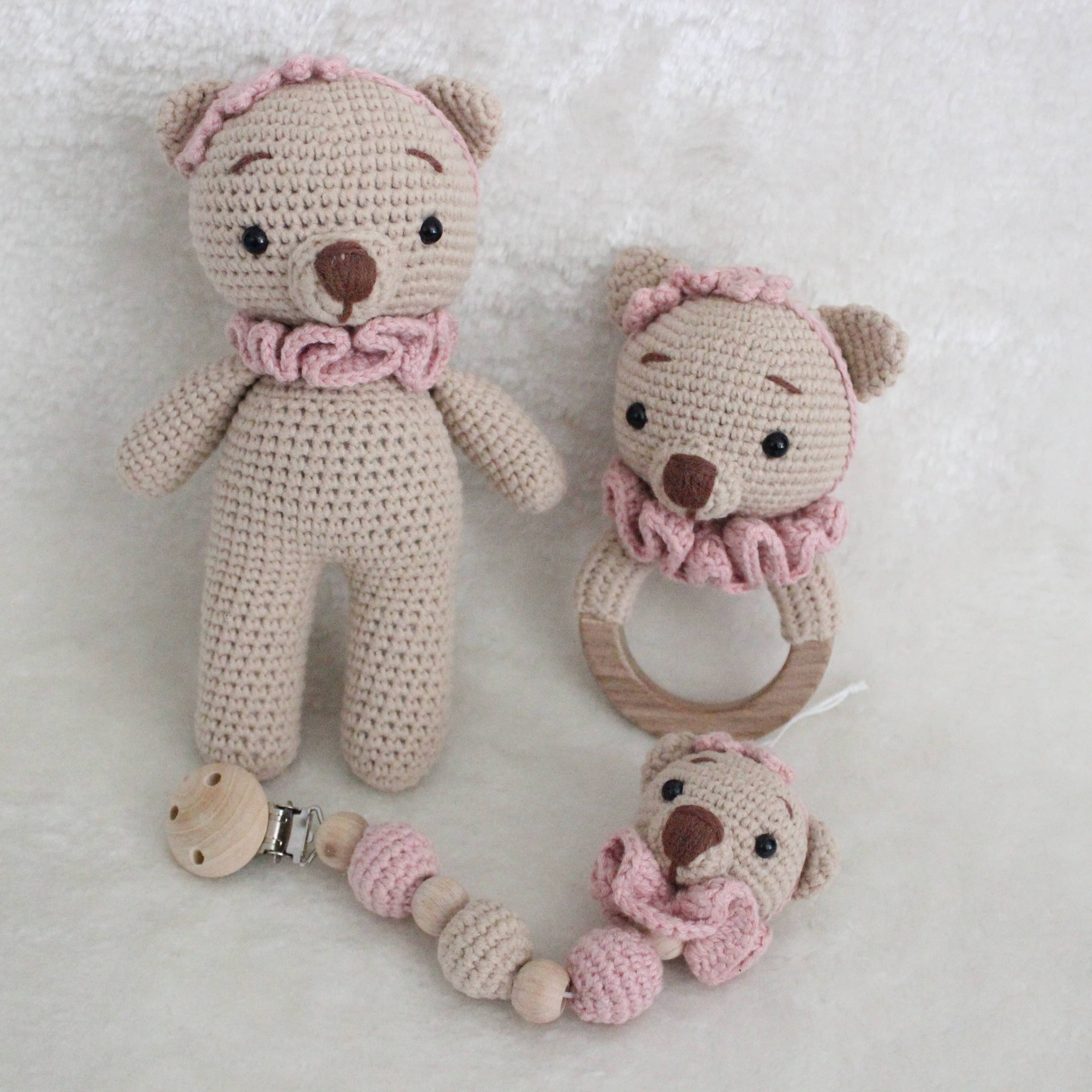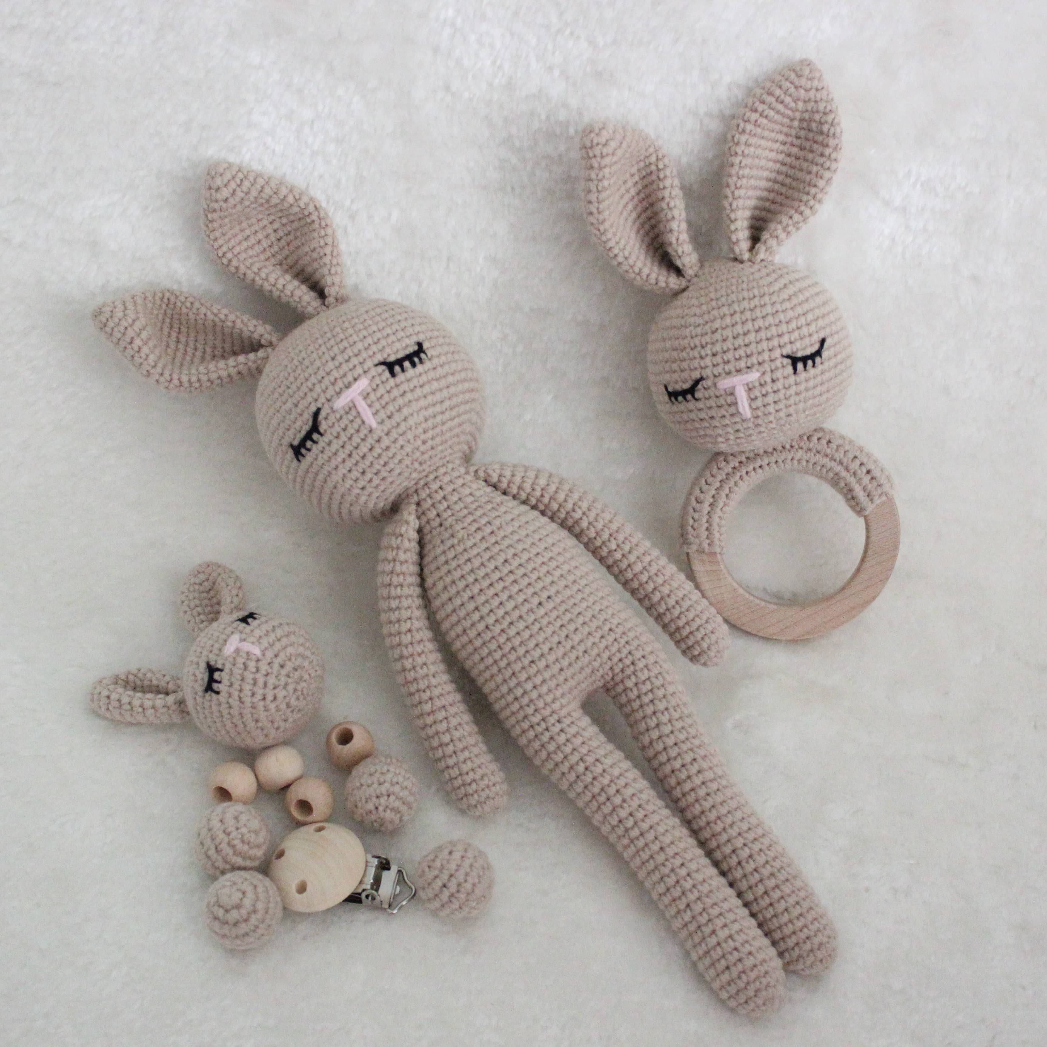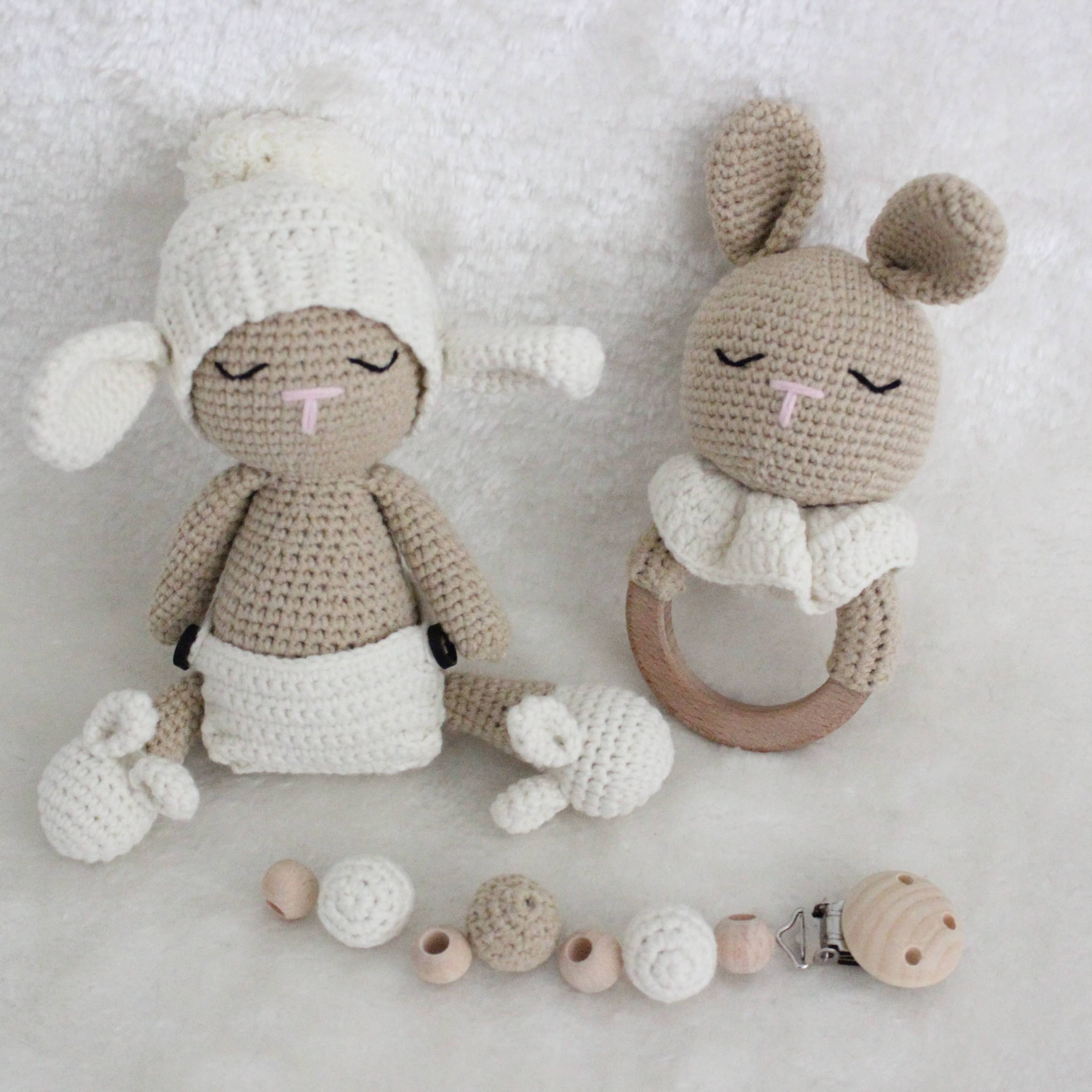 Amigurumi Set – Kuscheltier & personalisierbare Schnullerkette mit Rassel Dieses liebevoll handgefertigte Amigurumi-Set ist das perfekte Geschenk für kleine Entdecker und ein wunderschöner Begleiter im Alltag. Es besteht aus einem kuschelweichen Häkel-Tier, einer personalisierbaren Schnullerkette mit integrierter Rassel und einem Holzbeißring – alles in einem harmonisch aufeinander abgestimmten Design. Personalisiert mit deinem Wunschnamen Mach dein Set zu etwas ganz Besonderem: Die Schnullerkette kann individuell mit dem Namen deines Kindes gestaltet werden. Trage einfach den gewünschten Namen bei der Bestellung in das entsprechende Feld ein. Hochwertige & kinderfreundliche Materialien Alle Teile werden aus 100 % Baumwollgarn gehäkelt und enthalten keinerlei schädliche Stoffe – perfekt geeignet für Babys und Kleinkinder. Die verwendeten Holzperlen und der Beißring sind speichelfest und glatt verarbeitet. **Pflegehinweise:** - Kuscheltier: Waschbar bei 30 °C im Schonwaschgang. Kein Bleichmittel verwenden. Liegend trocknen – bitte nicht aufhängen. - Schnullerkette & Rassel: Nicht waschen. Bitte nur mit einem feuchten Tuch abwischen. Dieses Set wurde mit viel Liebe zum Detail gefertigt – wir hoffen, es findet einen Lieblingsplatz in eurem Zuhause und wird ein treuer Begleiter für viele schöne Momente.