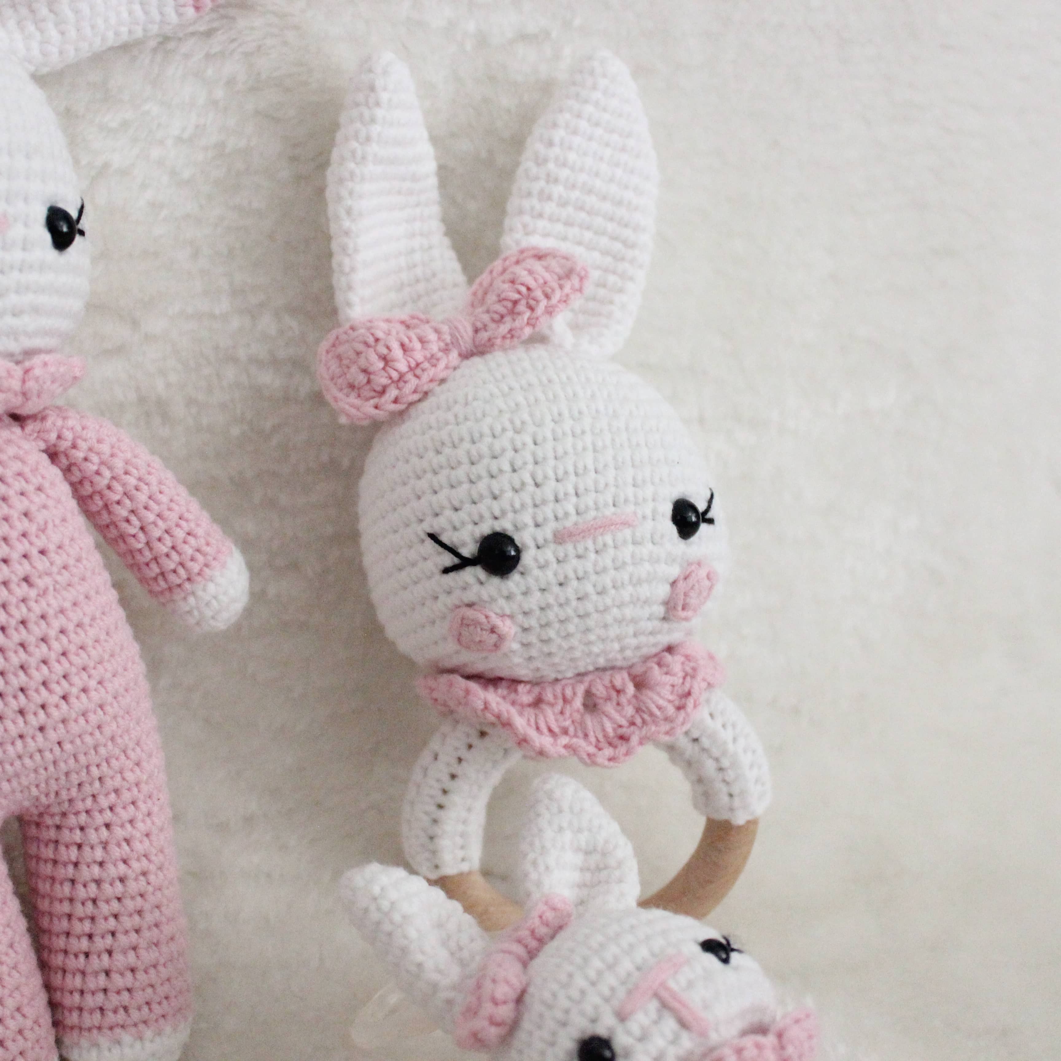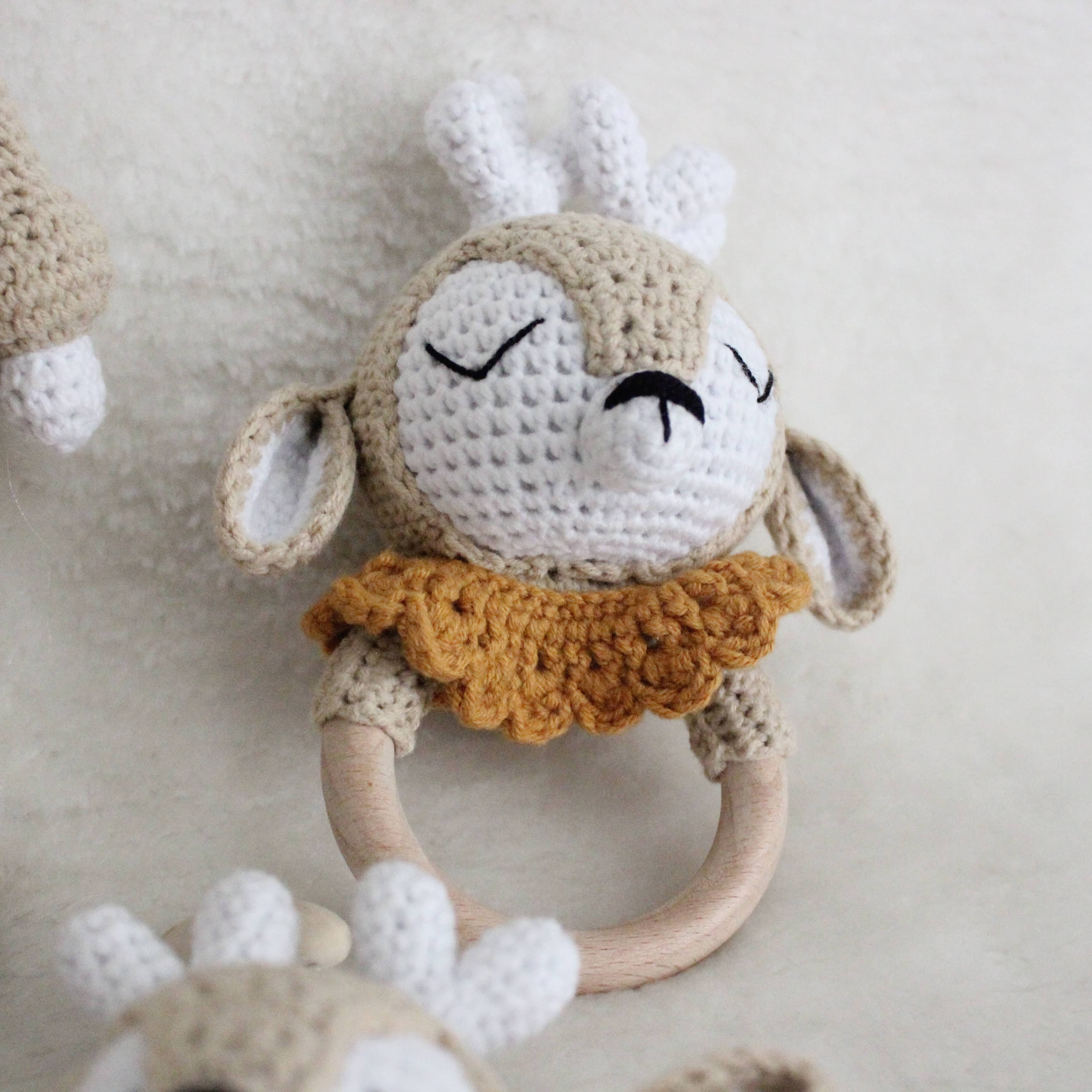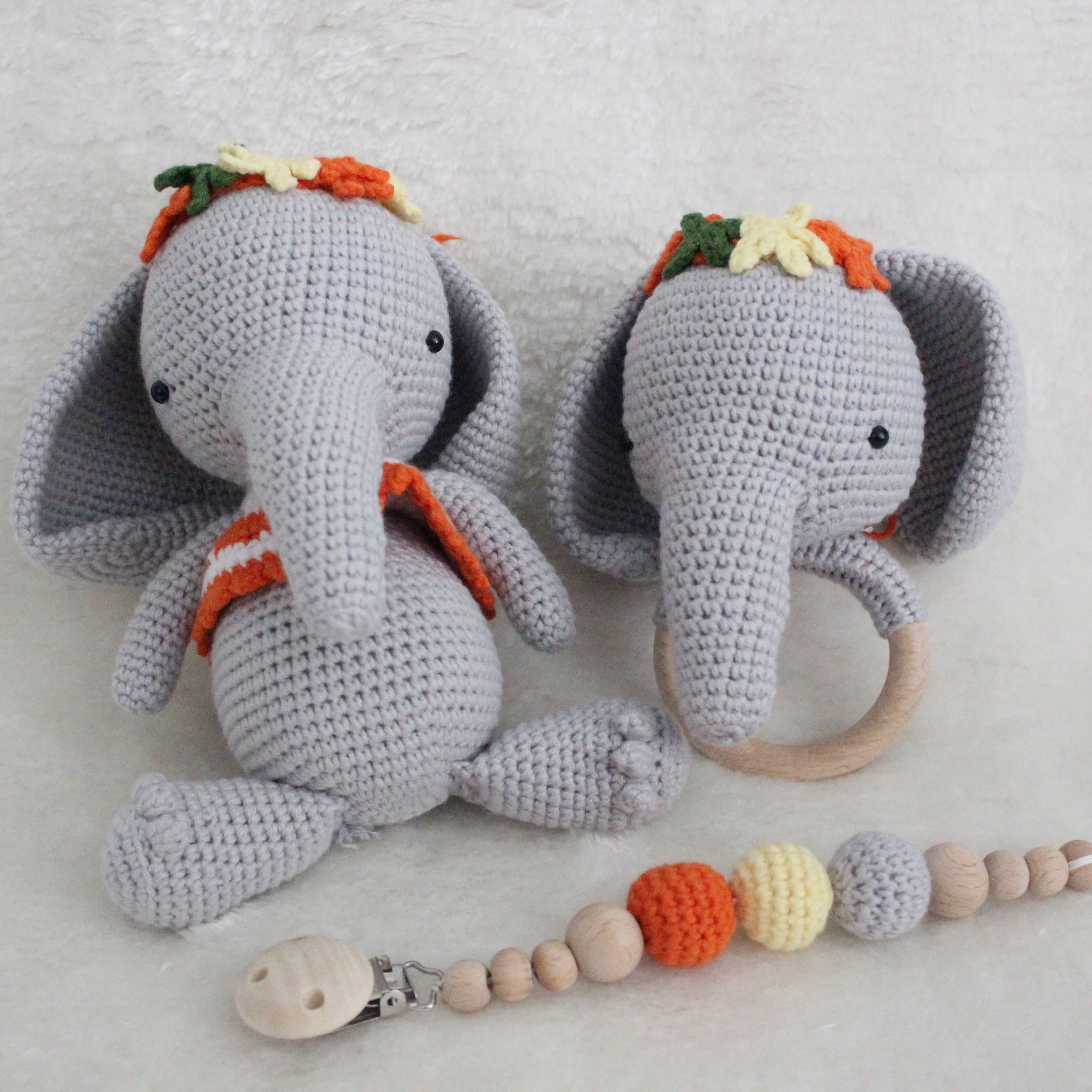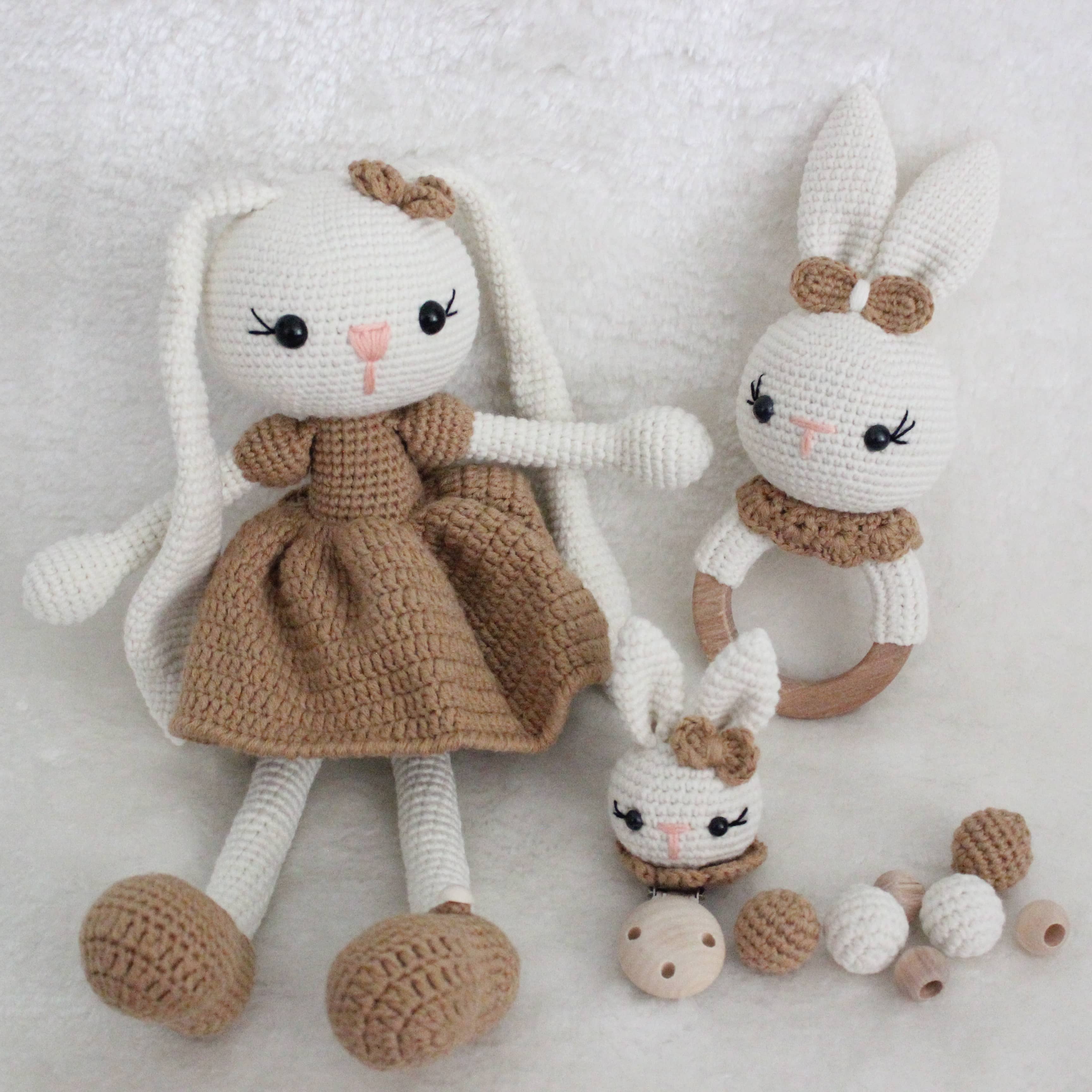 Amigurumi Set – Kuscheltier & personalisierbare Schnullerkette mit Rassel Dieses liebevoll handgefertigte Amigurumi-Set ist das perfekte Geschenk für kleine Entdecker und ein wunderschöner Begleiter im Alltag. Es besteht aus einem kuschelweichen Häkel-Tier, einer personalisierbaren Schnullerkette mit integrierter Rassel und einem Holzbeißring – alles in einem harmonisch aufeinander abgestimmten Design. Personalisiert mit deinem Wunschnamen Mach dein Set zu etwas ganz Besonderem: Die Schnullerkette kann individuell mit dem Namen deines Kindes gestaltet werden. Trage einfach den gewünschten Namen bei der Bestellung in das entsprechende Feld ein. Hochwertige & kinderfreundliche Materialien Alle Teile werden aus 100 % Baumwollgarn gehäkelt und enthalten keinerlei schädliche Stoffe – perfekt geeignet für Babys und Kleinkinder. Die verwendeten Holzperlen und der Beißring sind speichelfest und glatt verarbeitet. **Pflegehinweise:** - Kuscheltier: Waschbar bei 30 °C im Schonwaschgang. Kein Bleichmittel verwenden. Liegend trocknen – bitte nicht aufhängen. - Schnullerkette & Rassel: Nicht waschen. Bitte nur mit einem feuchten Tuch abwischen. Dieses Set wurde mit viel Liebe zum Detail gefertigt – wir hoffen, es findet einen Lieblingsplatz in eurem Zuhause und wird ein treuer Begleiter für viele schöne Momente.